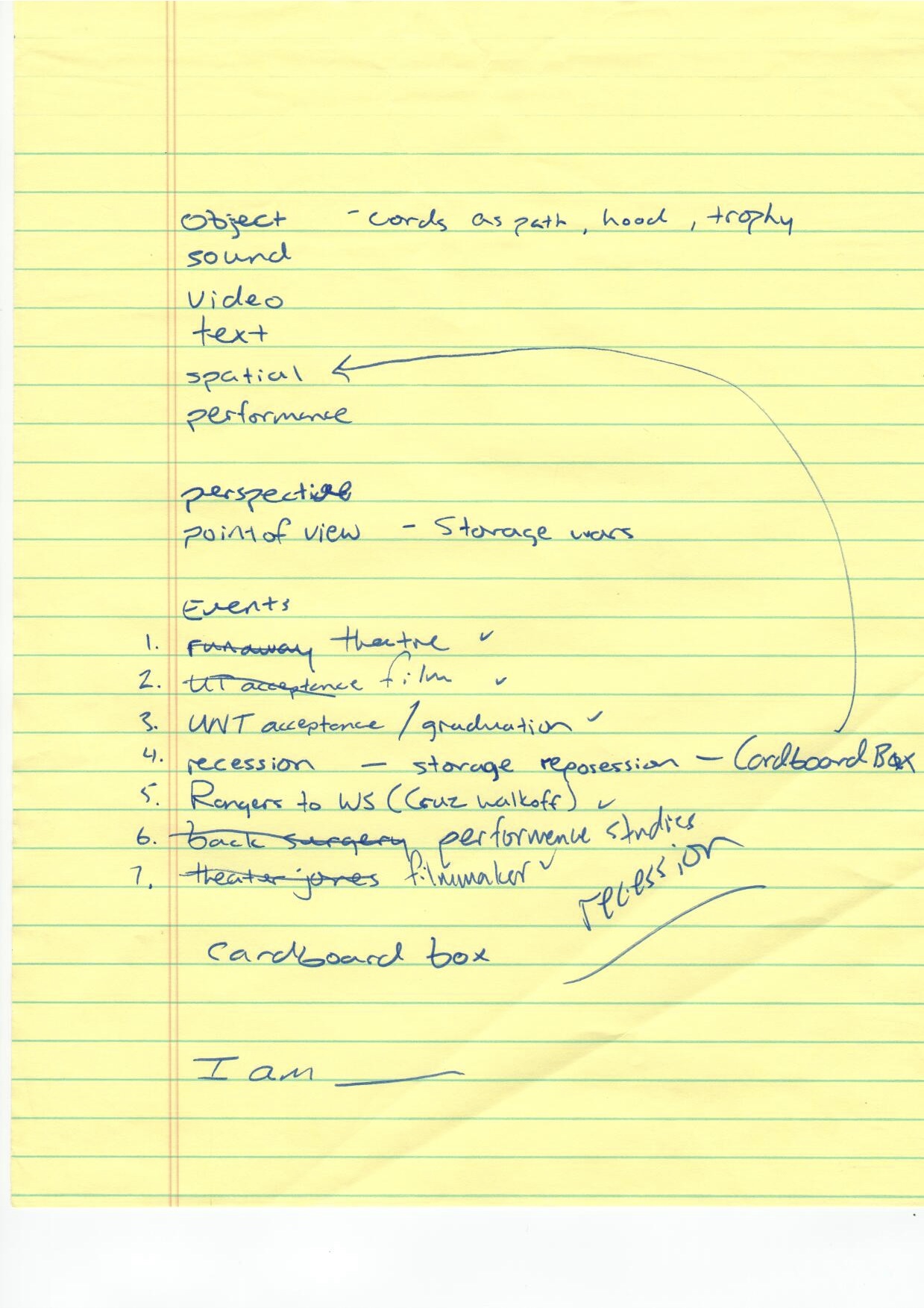 I know going into this class, that Tom is a fan of site specific artistic work. His group, Dead White Zombies specializes in site specific performance. And, I think it’s really cool and results in really visceral, honest performances. I like the notion. And it’s something I want to do with my work. Which leads me to the assignment (etude) for the week…